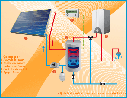 La energÃa solar térmica produce agua caliente por intercambio de calor entre el agua que hay en las placas y el agua que vamos a consumir. No se genera electricidad durante este proceso. Se utiliza en viviendas unifamiliares, bloques de pisos, instalaciones deportivas, etc.
